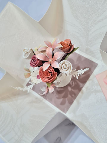 Individually handcrafted paper flowers. Love in a box collection: a pop up box with a bouquet of flowers inside. Picture of love collection: a picture frame with a spread of flowers inside and customised message. Special keepsakes for special occasions.